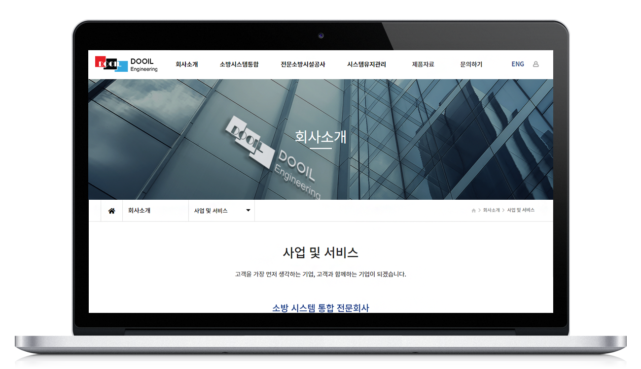 ㈜두일엔지니어링(Dooil Engineering. Co., Ltd) 웹사이트의 전체적인 시각적 디자인(색상, 구체적인 레이아웃, 사용된 이미지 등)이나 최신 웹 트렌드 적용. 전문 기술 기업의 웹사이트인 만큼 신뢰성을 주기 위해 직관적인 색상을 사용하고 정보 전달에 효율적인 레이아웃을 채택. 기업정보를 제공하는 데 중점. PC, 모바일 등 기기에서 최적화된 화면 제공.