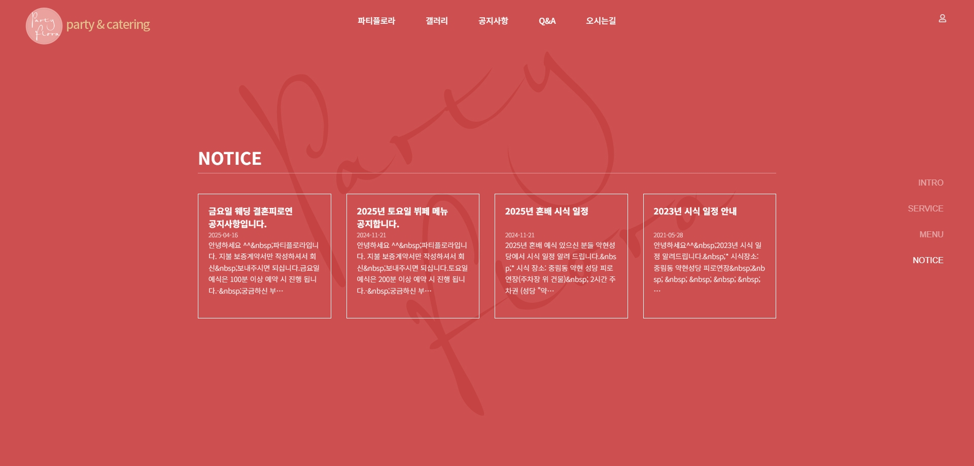 파티플로라(partyflora)는 프리미엄 파티 케이터링 및 공간 연출 전문 기업. 푸드스타일리스트, 플로리스트, 파티플래너가 협업하여 웨딩, 돌잔치, 기업 행사 등 다양한 이벤트에 맞춤형 메뉴와 감각적인 공간 장식을 연출하고 고객의 컨셉과 행사 성격에 따라 사전 방문 상담을 통해 최적의 레이아웃과 테이블 코디네이션을 제안하며, 계절과 트렌드를 반영한 메뉴와 플라워 디자인으로 특별한 경험제공